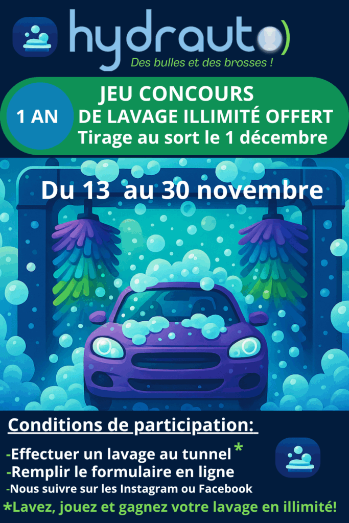Gagnez votre Pass Illimité pendant un an! Jeu concours du 13 au 30 novembre 2025 Formulaire Je participe... Nom(Nécessaire) Prénom Nom E-mail(Nécessaire) Téléphone(Nécessaire)Immatriculation véhicule(Nécessaire)Soin validé au guichet(Nécessaire) Éco Basic Soft Expert Conditions générales du concours(Nécessaire)- Effectuer un moins un passage au tunnel (le soin choisi détermine votre Pass Illimité annuel). - Remplir le formulaire en ligne "Je participe..." - Vous possédez déjà un Pass Illimité? (l'offre gratuite prend effet à la fin de votre engagement) - Participation réservée aux clients particuliers/professionnels. - Les données personnelles recueillies dans le cadre du jeu concours sont utilisées uniquement pour sa gestion et ne seront en aucun cas transmises à des tiers. J’accepte les conditions générales du concours.